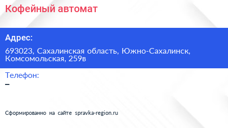 Кофейный автомат по адресу 693023, Сахалинская область, Южно-Сахалинск, Комсомольская, 259в в дальнейшем Организация, размещена в следующих категориях: