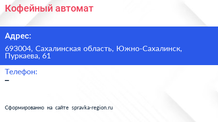 Кофейный автомат по адресу 693004, Сахалинская область, Южно-Сахалинск, Пуркаева, 61 в дальнейшем Организация, размещена в следующих категориях: