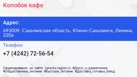 Колобок, кафе по адресу 693009, Сахалинская область, Южно-Сахалинск, Ленина, 220а в дальнейшем Организация, размещена в следующих категориях: