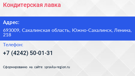 Кондитерская лавка по адресу 693009, Сахалинская область, Южно-Сахалинск, Ленина, 218 в дальнейшем Организация, размещена в следующих категориях: