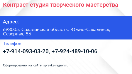 Контраст, студия творческого мастерства по адресу 693005, Сахалинская область, Южно-Сахалинск, Северная, 56 в дальнейшем Организация, размещена в следующих категориях: