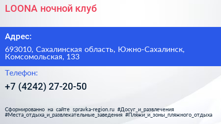 LOONA, ночной клуб по адресу 693010, Сахалинская область, Южно-Сахалинск, Комсомольская, 133 в дальнейшем Организация, размещена в следующих категориях: