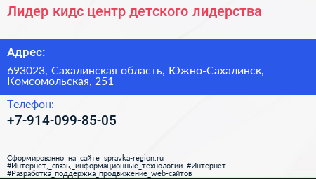 Лидер кидс, центр детского лидерства по адресу 693023, Сахалинская область, Южно-Сахалинск, Комсомольская, 251 в дальнейшем Организация, размещена в следующих категориях: