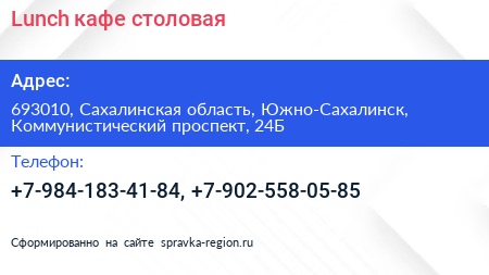 Lunch, кафе-столовая по адресу 693010, Сахалинская область, Южно-Сахалинск, Коммунистический проспект, 24Б в дальнейшем Организация, размещена в следующих категориях: