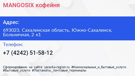 MANGOSIX, кофейня по адресу 693023, Сахалинская область, Южно-Сахалинск, Больничная, 2 к1 в дальнейшем Организация, размещена в следующих категориях: