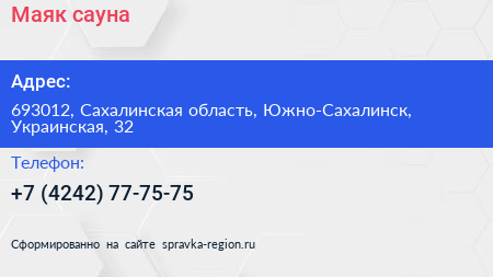Маяк, сауна по адресу 693012, Сахалинская область, Южно-Сахалинск, Украинская, 32 в дальнейшем Организация, размещена в следующих категориях:
