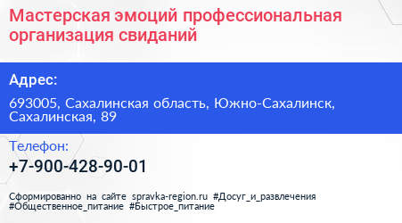 Мастерская эмоций, профессиональная организация свиданий по адресу 693005, Сахалинская область, Южно-Сахалинск, Сахалинская, 89 в дальнейшем Организация, размещена в следующих категориях: