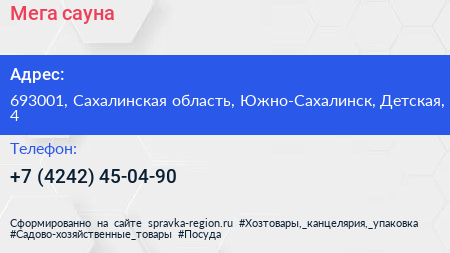 Мега, сауна по адресу 693001, Сахалинская область, Южно-Сахалинск, Детская, 4 в дальнейшем Организация, размещена в следующих категориях: