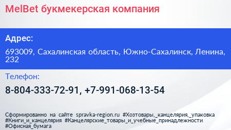 MelBet, букмекерская компания по адресу 693009, Сахалинская область, Южно-Сахалинск, Ленина, 232 в дальнейшем Организация, размещена в следующих категориях: