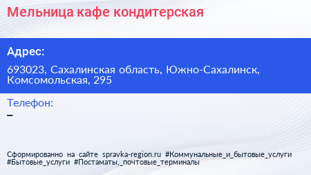 Мельница, кафе-кондитерская по адресу 693023, Сахалинская область, Южно-Сахалинск, Комсомольская, 295 в дальнейшем Организация, размещена в следующих категориях: