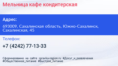 Мельница, кафе-кондитерская по адресу 693009, Сахалинская область, Южно-Сахалинск, Сахалинская, 45 в дальнейшем Организация, размещена в следующих категориях: