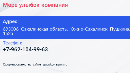 Море улыбок, компания по адресу 693006, Сахалинская область, Южно-Сахалинск, Пушкина, 152а в дальнейшем Организация, размещена в следующих категориях: