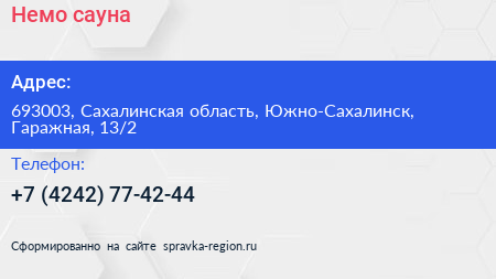 Немо, сауна по адресу 693003, Сахалинская область, Южно-Сахалинск, Гаражная, 13/2 в дальнейшем Организация, размещена в следующих категориях: