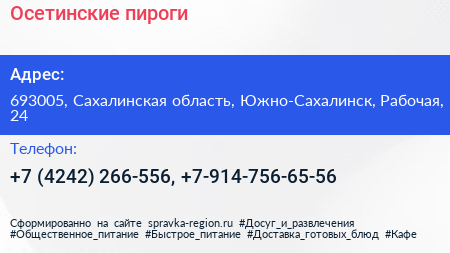 Осетинские пироги по адресу 693005, Сахалинская область, Южно-Сахалинск, Рабочая, 24 в дальнейшем Организация, размещена в следующих категориях:
