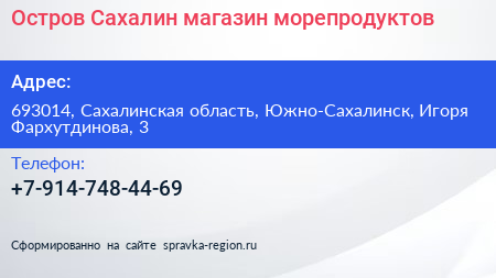 Остров Сахалин, магазин морепродуктов по адресу 693014, Сахалинская область, Южно-Сахалинск, Игоря Фархутдинова, 3 в дальнейшем Организация, размещена в следующих категориях: