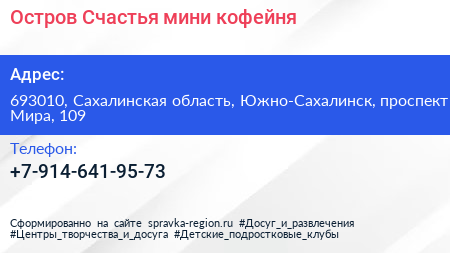 Остров Счастья, мини-кофейня по адресу 693010, Сахалинская область, Южно-Сахалинск, проспект Мира, 109 в дальнейшем Организация, размещена в следующих категориях: