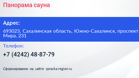 Панорама, сауна по адресу 693023, Сахалинская область, Южно-Сахалинск, проспект Мира, 231 в дальнейшем Организация, размещена в следующих категориях: