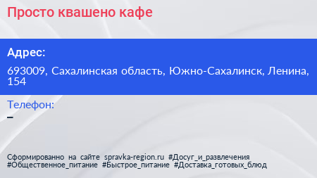 Просто квашено, кафе по адресу 693009, Сахалинская область, Южно-Сахалинск, Ленина, 154 в дальнейшем Организация, размещена в следующих категориях:
