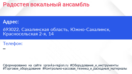 Радостея, вокальный ансамбль по адресу 693022, Сахалинская область, Южно-Сахалинск, Красносельская 2-я, 14 в дальнейшем Организация, размещена в следующих категориях: