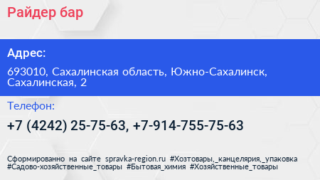 Райдер, бар по адресу 693010, Сахалинская область, Южно-Сахалинск, Сахалинская, 2 в дальнейшем Организация, размещена в следующих категориях: