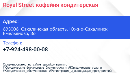 Royal Street, кофейня-кондитерская по адресу 693006, Сахалинская область, Южно-Сахалинск, Емельянова, 36 в дальнейшем Организация, размещена в следующих категориях: