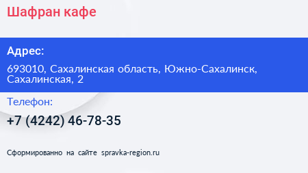 Шафран, кафе по адресу 693010, Сахалинская область, Южно-Сахалинск, Сахалинская, 2 в дальнейшем Организация, размещена в следующих категориях: