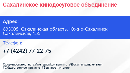 Сахалинское кинодосуговое объединение по адресу 693005, Сахалинская область, Южно-Сахалинск, Сахалинская, 155 в дальнейшем Организация, размещена в следующих категориях: