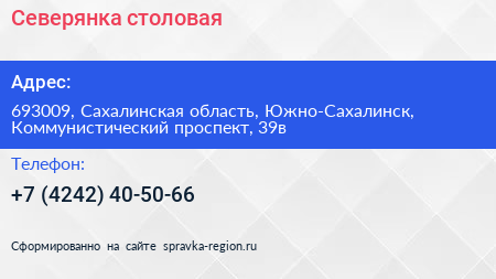 Северянка, столовая по адресу 693009, Сахалинская область, Южно-Сахалинск, Коммунистический проспект, 39в в дальнейшем Организация, размещена в следующих категориях: