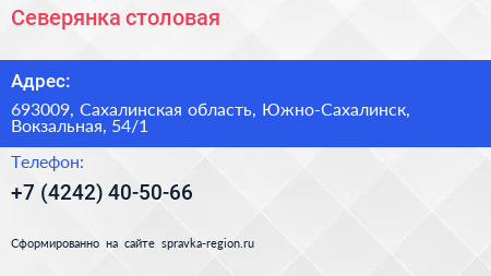 Северянка, столовая по адресу 693009, Сахалинская область, Южно-Сахалинск, Вокзальная, 54/1 в дальнейшем Организация, размещена в следующих категориях: