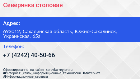Северянка, столовая по адресу 693012, Сахалинская область, Южно-Сахалинск, Украинская, 65а в дальнейшем Организация, размещена в следующих категориях: