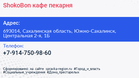 ShokoBon, кафе-пекарня по адресу 693014, Сахалинская область, Южно-Сахалинск, Центральная 2-я, 1Б в дальнейшем Организация, размещена в следующих категориях: