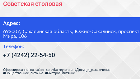 Советская, столовая по адресу 693007, Сахалинская область, Южно-Сахалинск, проспект Мира, 106 в дальнейшем Организация, размещена в следующих категориях: