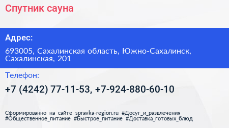 Спутник, сауна по адресу 693005, Сахалинская область, Южно-Сахалинск, Сахалинская, 201 в дальнейшем Организация, размещена в следующих категориях: