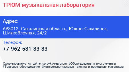 ТРЮМ, музыкальная лаборатория по адресу 693012, Сахалинская область, Южно-Сахалинск, Шлакоблочная, 24/2 в дальнейшем Организация, размещена в следующих категориях: