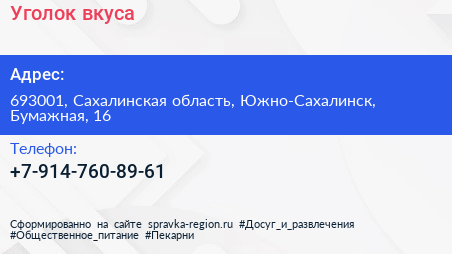 Уголок вкуса по адресу 693001, Сахалинская область, Южно-Сахалинск, Бумажная, 16 в дальнейшем Организация, размещена в следующих категориях: