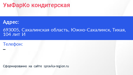 УмФарКо, кондитерская по адресу 693005, Сахалинская область, Южно-Сахалинск, Тихая, 104 лит И в дальнейшем Организация, размещена в следующих категориях:
