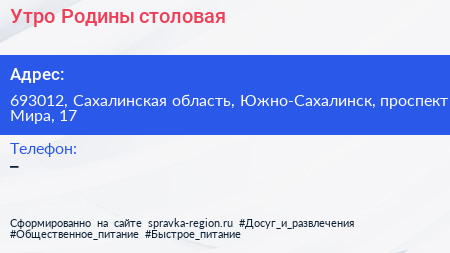 Утро Родины, столовая по адресу 693012, Сахалинская область, Южно-Сахалинск, проспект Мира, 17 в дальнейшем Организация, размещена в следующих категориях: