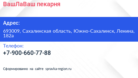 ВашЛаВаш, пекарня по адресу 693009, Сахалинская область, Южно-Сахалинск, Ленина, 182а в дальнейшем Организация, размещена в следующих категориях: