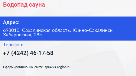 Водопад, сауна по адресу 693010, Сахалинская область, Южно-Сахалинск, Хабаровская, 29Б в дальнейшем Организация, размещена в следующих категориях: