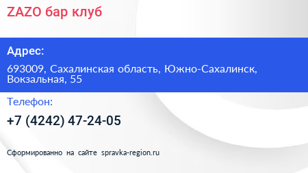 ZAZO, бар-клуб по адресу 693009, Сахалинская область, Южно-Сахалинск, Вокзальная, 55 в дальнейшем Организация, размещена в следующих категориях: