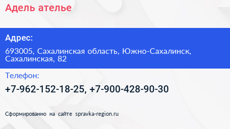 Адель, ателье по адресу 693005, Сахалинская область, Южно-Сахалинск, Сахалинская, 82 в дальнейшем Организация, размещена в следующих категориях: