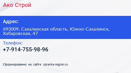 Ако Строй по адресу 693009, Сахалинская область, Южно-Сахалинск, Хабаровская, 47 в дальнейшем Организация, размещена в следующих категориях: