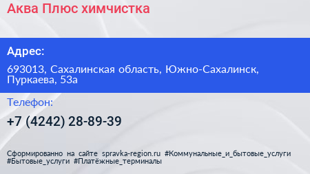 Аква Плюс, химчистка по адресу 693013, Сахалинская область, Южно-Сахалинск, Пуркаева, 53а в дальнейшем Организация, размещена в следующих категориях: