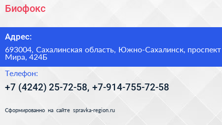 Биофокс по адресу 693004, Сахалинская область, Южно-Сахалинск, проспект Мира, 424Б в дальнейшем Организация, размещена в следующих категориях: