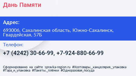 Дань Памяти по адресу 693006, Сахалинская область, Южно-Сахалинск, Гвардейская, 57Б в дальнейшем Организация, размещена в следующих категориях: