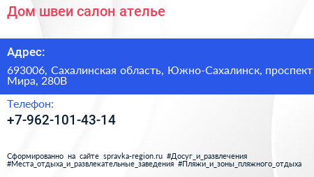 Дом швеи, салон-ателье по адресу 693006, Сахалинская область, Южно-Сахалинск, проспект Мира, 280В в дальнейшем Организация, размещена в следующих категориях: