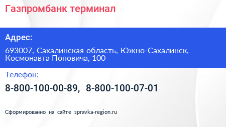 Газпромбанк, терминал по адресу 693007, Сахалинская область, Южно-Сахалинск, Космонавта Поповича, 100 в дальнейшем Организация, размещена в следующих категориях: