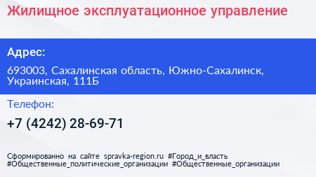 Жилищное эксплуатационное управление по адресу 693003, Сахалинская область, Южно-Сахалинск, Украинская, 111Б в дальнейшем Организация, размещена в следующих категориях: