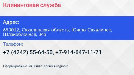 Клининговая служба по адресу 693012, Сахалинская область, Южно-Сахалинск, Шлакоблочная, 34а в дальнейшем Организация, размещена в следующих категориях: