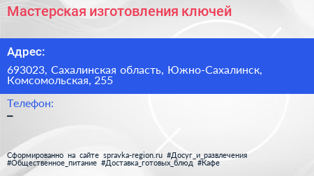 Мастерская изготовления ключей по адресу 693023, Сахалинская область, Южно-Сахалинск, Комсомольская, 255 в дальнейшем Организация, размещена в следующих категориях: